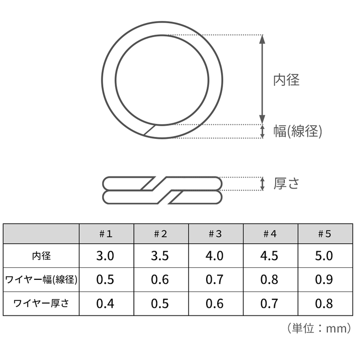 - 平打ち加工とは:ワイヤーの上下を平らに加工したもの。強度が増し、ねじれや開きなどの変形がしにくくなります。丸線に比べてわずかですがワイヤーの幅が太くなっています。